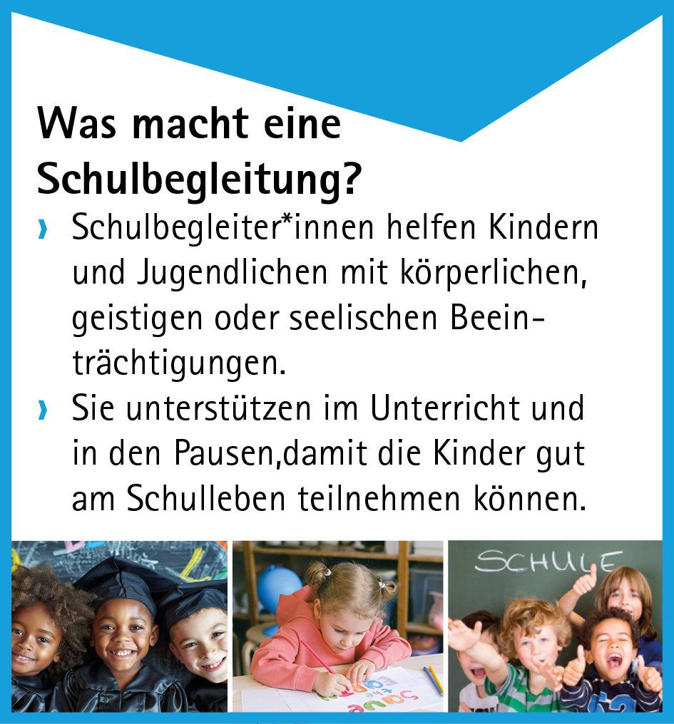 Die Aufgabe einer Schulbegleitung ist es, Schüler*innen mit körperlichen, geistigen oder seelischen Beeinträchtigungen den Besuch einer Regelschule zu ermöglichen. Ein/e Schulbegleiter*in ist in der Regel über einen längeren Zeitraum hinweg für ein Kind zuständig und begleitet dieses sowohl im Unterricht als auch in den Pausen. Die/der päd. Mitarbeiter*in begleitet im Ganztagsangebot die Kinder beim Mittagessen, gibt Unterstützung bei den Hausaufgaben und organisiert Projekte und Freizeitangebote.
